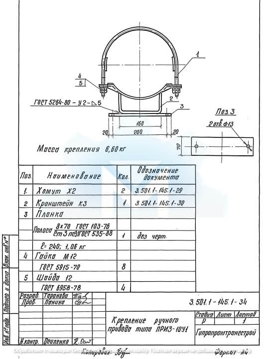 Крепление ручного привода по типовому проекту ТМП 32-4863/339-3 крепится к опоре С1.85/10.1 с помощью хомута ТМП 32-4863/339-3.24.